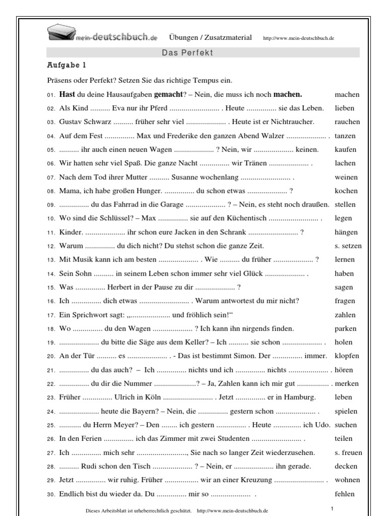 It is valuable for consolidating Perfekt vollendete Gegenwart in English and can be used for enhancing your class Schreiben and Lesen skills. Bungen zum Perfekt Zusatzmaterialien und Arbeitsbltter zum Perfekt Partizip II Anbei werden bungsmaterialien zur Festigung der theoretischen Kenntnisse angeboten. Kostenlose Arbeitsbltter mit Lsungen zur 1.