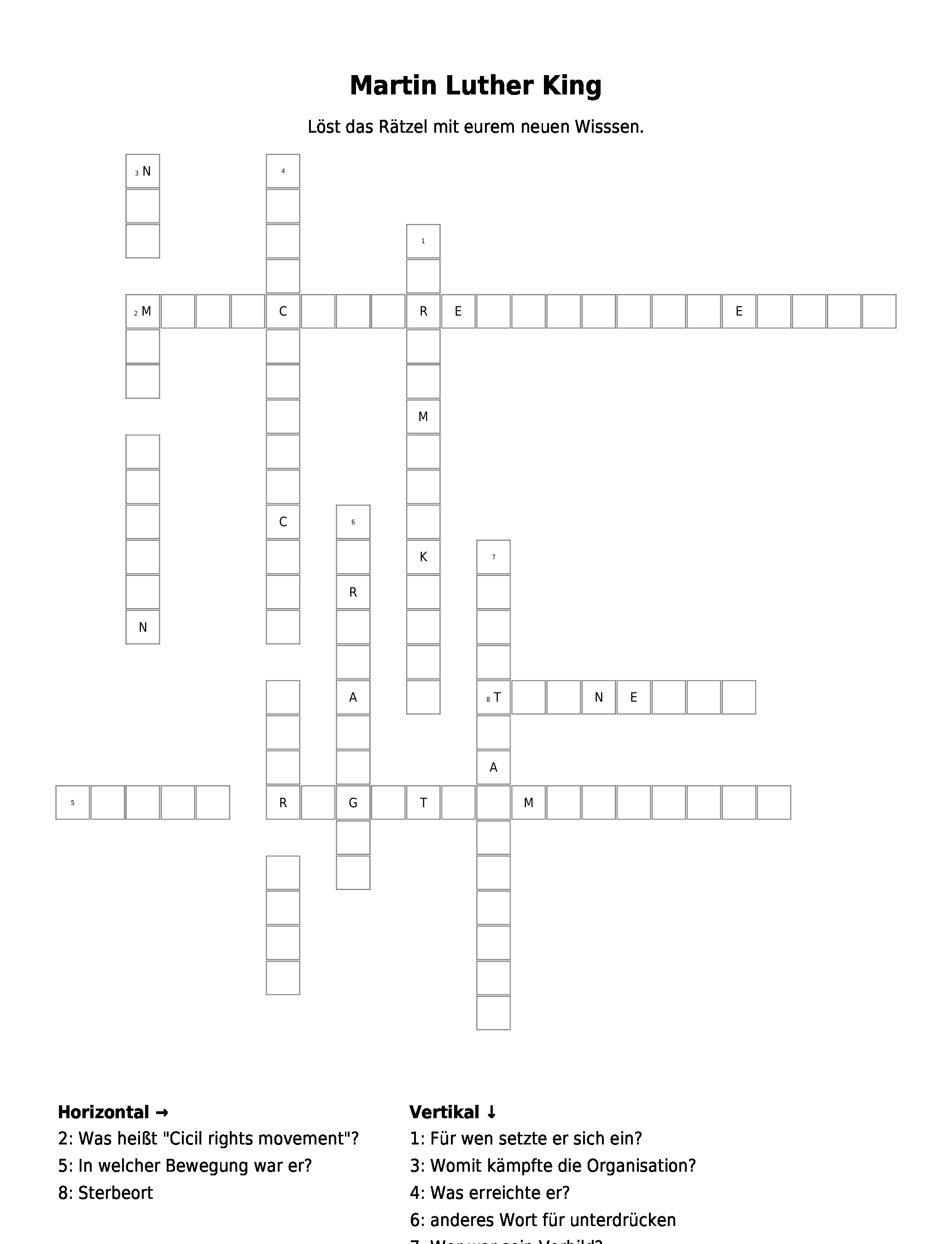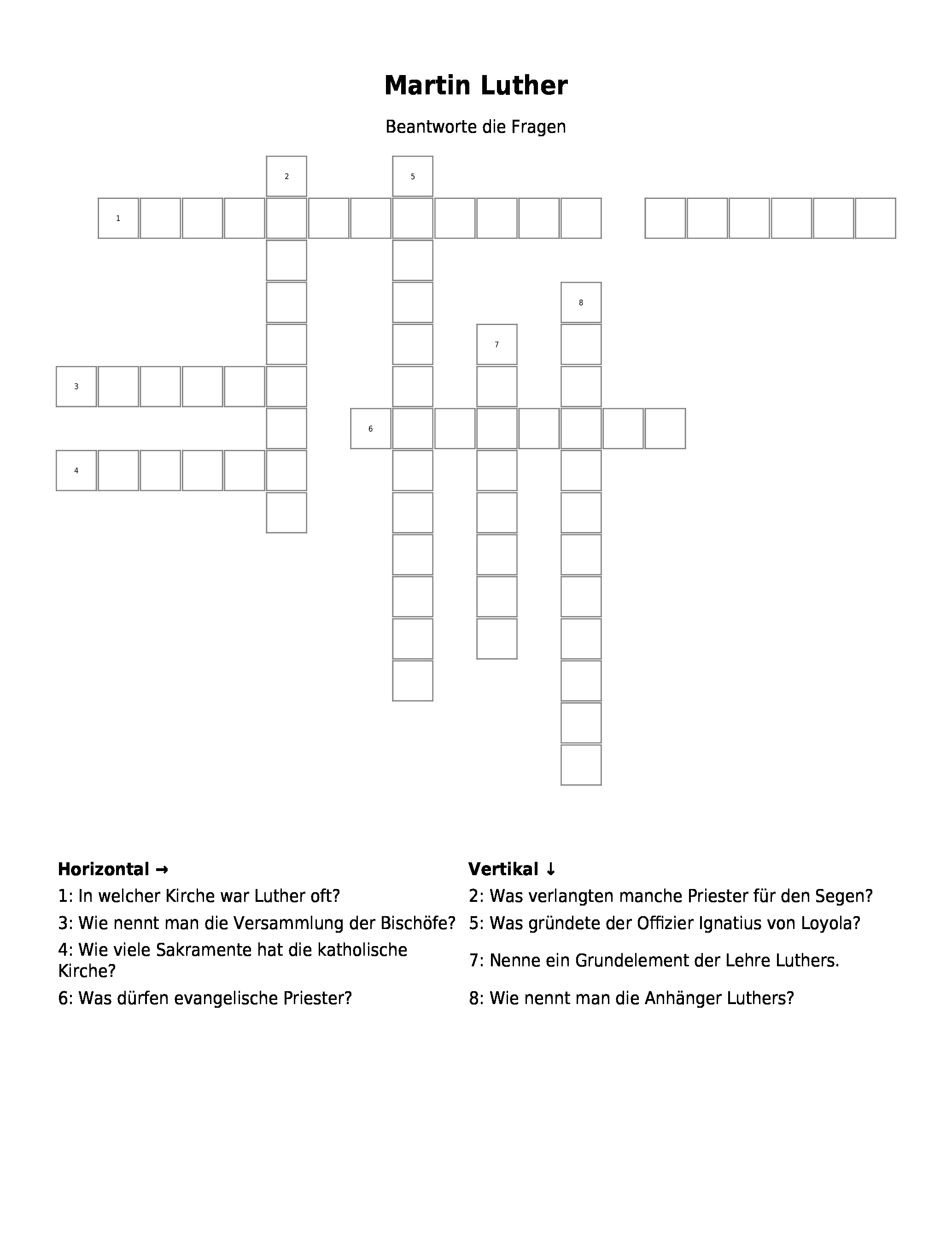 Arbeitsblatt Lsungsblatt Sie knnen das Kreuzwortrtsel Martin Luther kostenlos als PDF-Datei 41kb herunterladen. In Wittenberg in Sachsenanhalt. Als Mglichkeit zur Selbstkontrolle knnen Lsungsseiten erstellt werden.